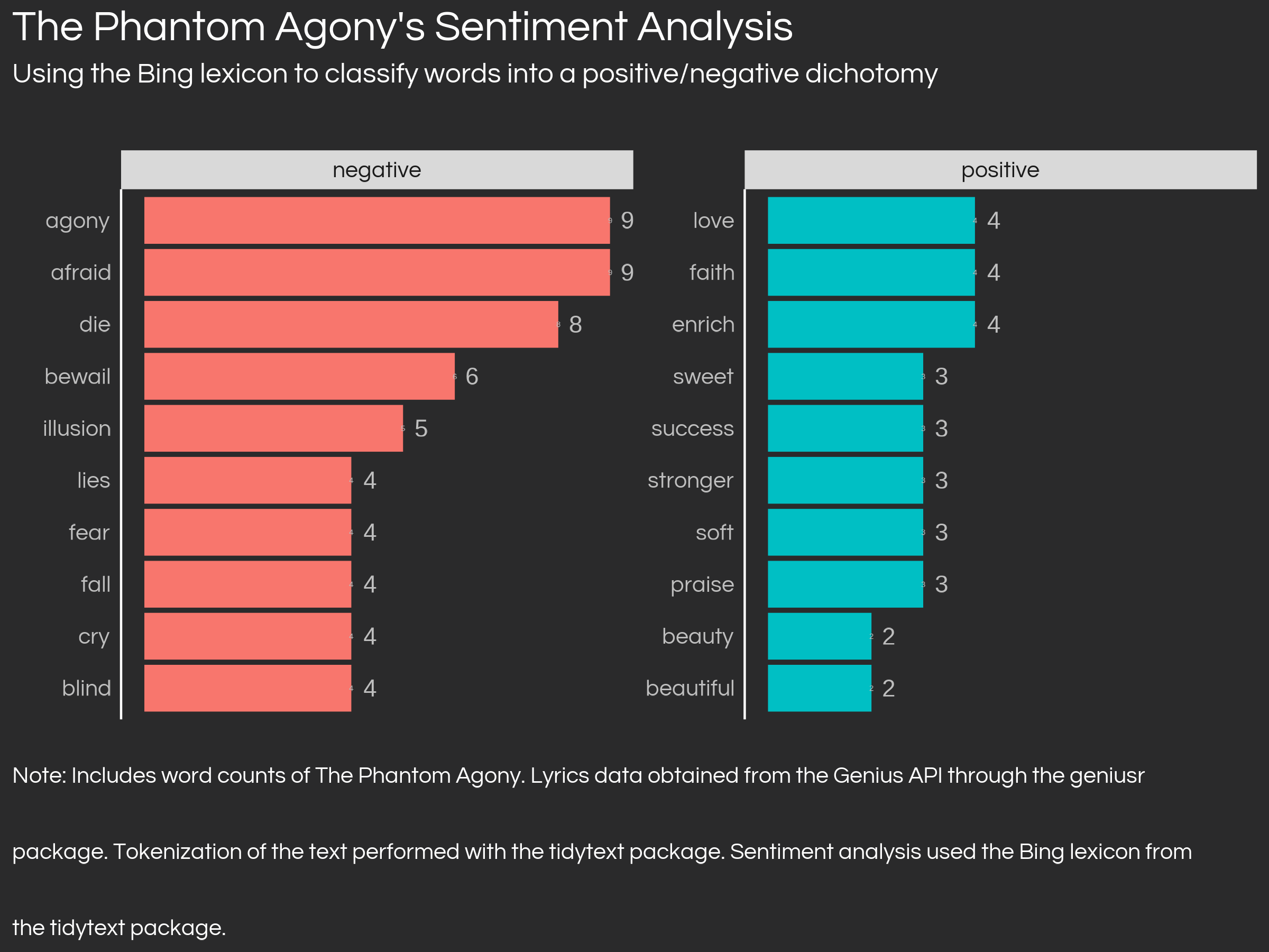 Part of a personal blog post which uses several musical data sources to perfom analyses of musical data on the dutch symphonic metal band, Epica. I perform tidy text analysis with different lexicons after tokenizing all lyrics from Epica’s discography, sourced from the Genius API. It involved complex data cleaning through table reshaping, record linkage and fuzzy joins.