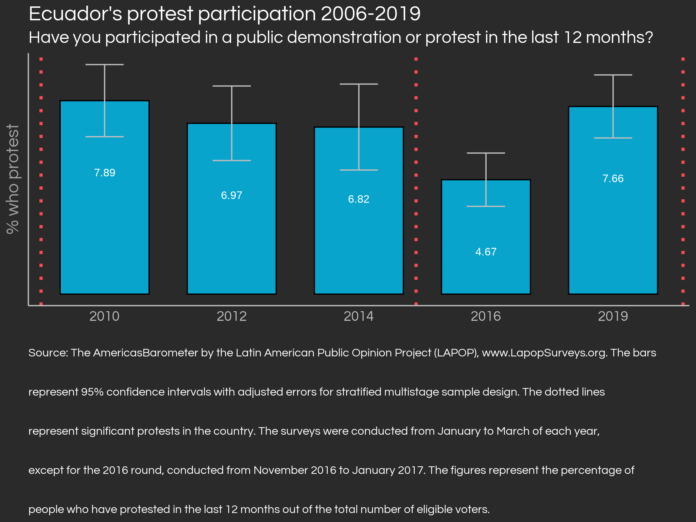 After a series of protests developed in Ecuador in July 2022, I analyzed public opinion variables to try to understand the public sentiment behind the protest. I implement survey design adjustments from the AmericasBarometer survey to correct for oversampling of some regions and to present survey-robust confidence intervals in visualizations.